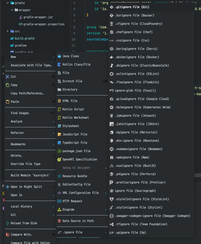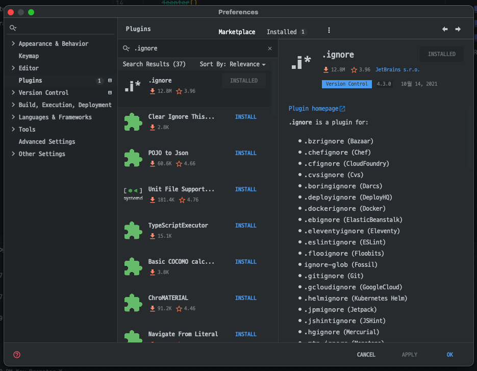 플러그인 중에 ignore 작성 관련 기능을 제공해주는 것이 있어 해당 플러그인 설치(검색 단축키: command +Shit + A)