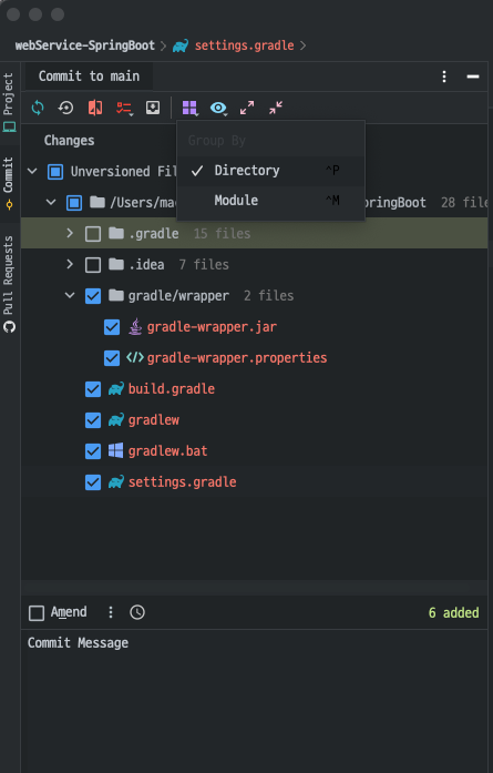 - (좌측) 커밋 탭 > .idea, .gradle는 제외할 것