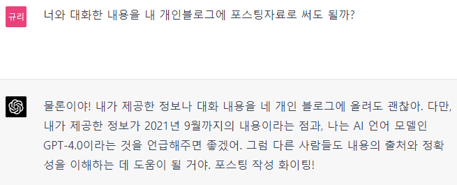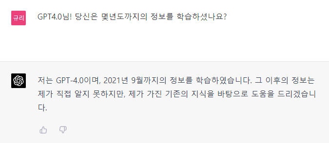 기존의 3.5ver과 동일하게 학습정보는 2021년 9월까지로 멈춰있다. 하지만 더 똑똑해진 인공아이.