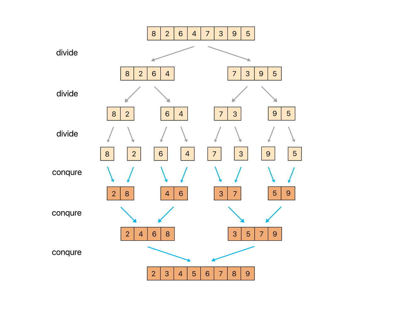 : 기존의 배열을 반으로 지속적으로 나누어 1개만 남을 때까지 분할, 그 뒤 다시 정렬해가며 하나로 합치는 방식