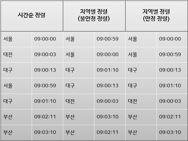 | Stable | 같은 값의 데이터의 기존 순서 유지를 보장 가능 |