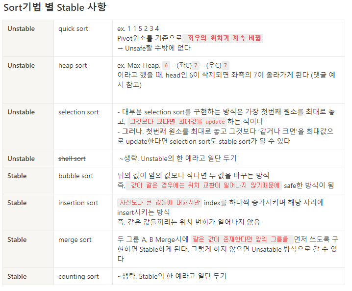 Sort기법 별 Stable 사항 (Notion 정리 사진으로 대체)