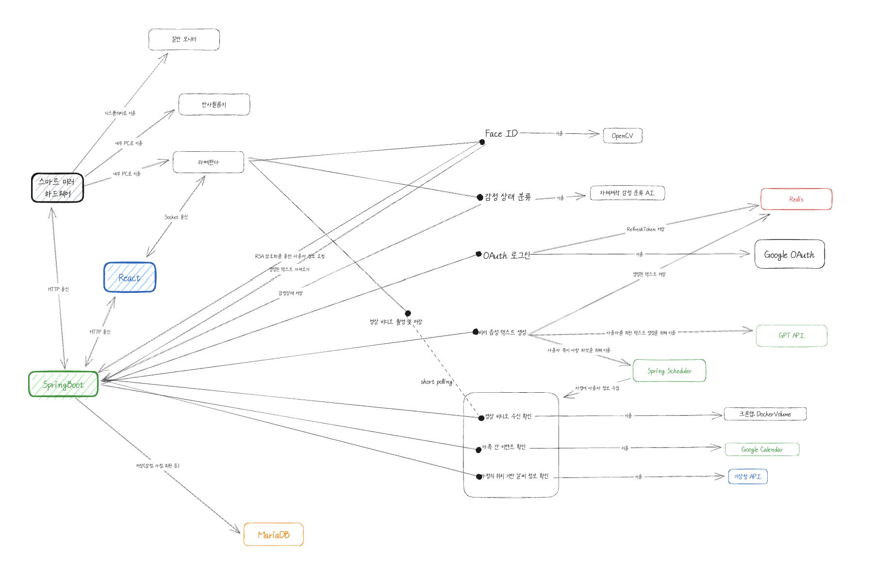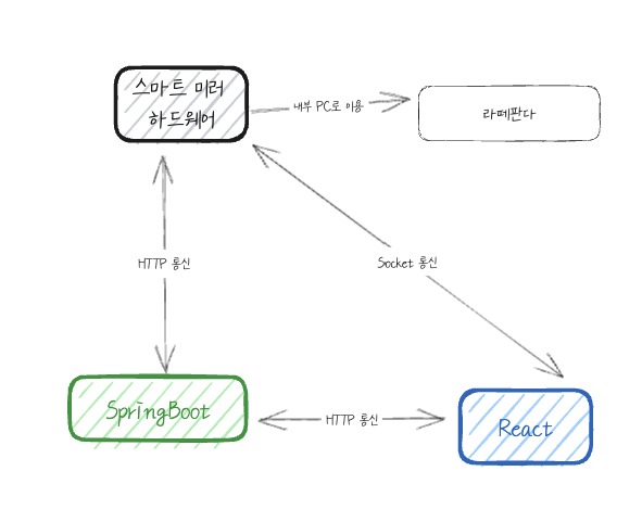 하드웨어(라떼판다)와 Front(React), Backend(SpringBoot)가 서로 통신을 제각각으로 하고 있다.