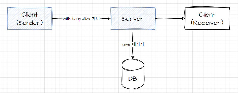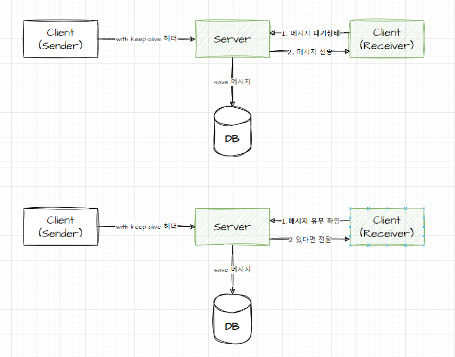 최초에 Client는 메시지 전송을 위한 Server와의 HTTP 연결을 만들었는데, 반대로 Server가 Client에게 연결을 만드는 방법은 따로 없다. 최소한, receiverClient가 먼저 연결을 하고 메시지 수신을 대기하는 상태라든지, 주기적으로 있냐고 뜨문뜨문 물어보든지 해야한다.