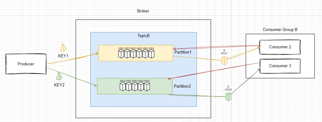 2. 노랑, 초록과 같이 Producer는 메시지 발생 시 key를 지정하여, 해당 Key로만 갈 수 있는 유일한 partition을 지정한다
