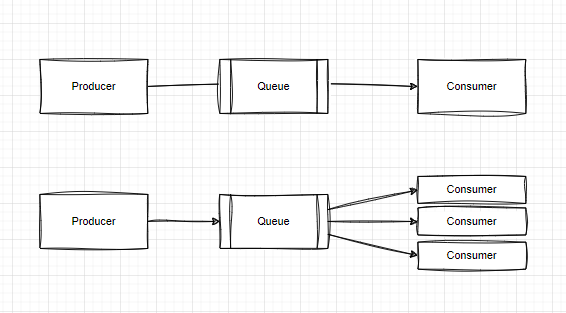 상단에 그린 것이 일반적인 메시지 큐다. 하나의 생산자는 메시지를 큐에 보내고, 이 큐로부터 하나의 소비자가 메시지를 처리한다.