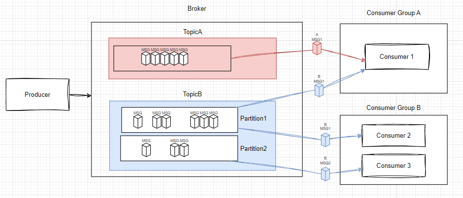 - ConsumerGorup 각각은 offset을 달리 갖고 있다(A그룹이 10까지 소비했더래도, B그룹은 3부터 소비할 수 있다)