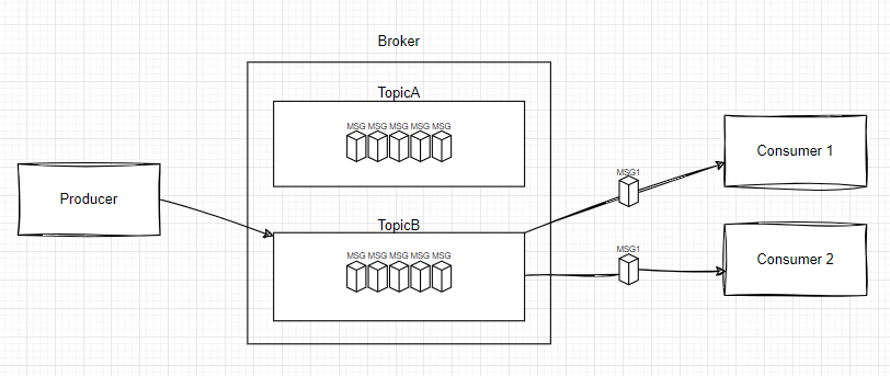Topic이라는 개념이 도입되는 메시지 모델이다. 큐에 전송된 특정 Topic 연관 메시지는 특정 Topic을 구독하고 있는 사용자 모두에게 전송한다. 이처럼 일대일 모델과는 대비되는 토픽 단위에 따라 메시지가 소비되고 있다