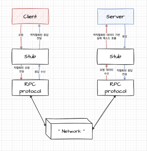 여기서 stub은 클라이언트가 메서드를 호출하기 위한 Proxy 객체로 데이터의 역직렬화/직렬화 동작을 수행한다. 이에 대해 그림으로 그려보면 아래와 같다.