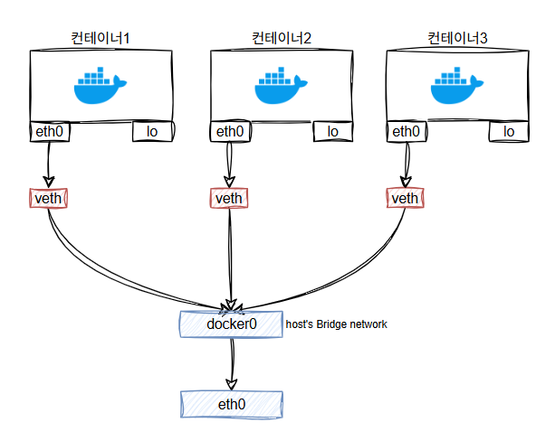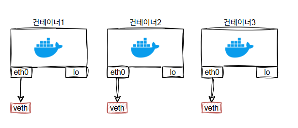 컨테이너가 있다. 컨테이너는 저마다 가상 이더넷 인터페이스인 veth가 존재한다. 이 veth라는 인터페이스는 사용자가 직접 생성할 필요가 없고 도커 엔진이 자동으로 생성해주는 애다.
