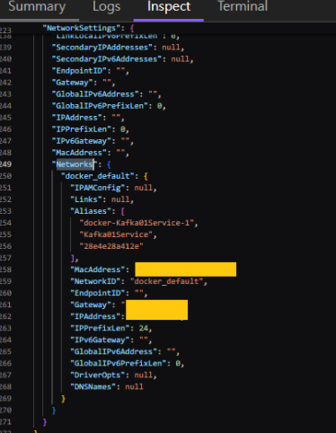 그 중, Kafka는 Compose를 통해 Broker 3개가 엮어놓아져 있기에 Inspect 내부를 살펴보면, 각각의 브로커가 순차적으로 IP를 할당해놓은 것을 확인한다. 즉, 컨테이너를 실행할 때 별도의 네트워크를 지정하지 않는다면 기본적인 Host Bridge Network에서 동작하며 IP를 순차적으로 할당받게 되어있다.