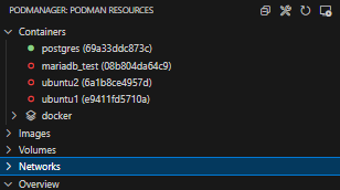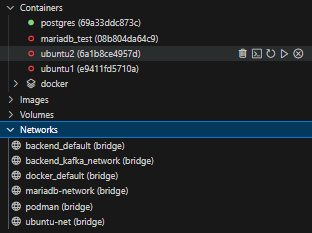 VScode의 확장도구로 podman이나 docker를 설치해주면 갖고 있는 컨테이너들을 살펴볼 수 있는데, NETWORK에 보면 지정해 준적이 따로 없어도 Bridge로 컨테이너들이 묶여있는 것을 볼 수 있다