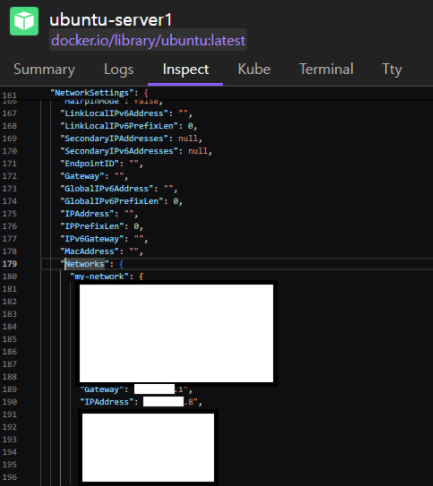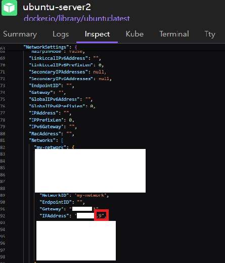 각 컨테이너 내부의 Inspect를 살펴보면 IP가 순차적으로 할당된 것을 확인해본다. network도 보면 설정해놓은 그룹으로 묶여있다.