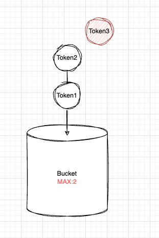 1초 마다 토큰이 생기고 있다. 그리고 버킷은 토큰을 담아두는 통으로써 1초마다 생기는 토큰을 받아주고 있다. 이 버킷은 최대크기(최대 토큰 수)가 정해져 있어서 그린 것과 같이 해당 MAX 값을 넘어선다면 새로 생성되었던 토큰은 버려질 예정이다.