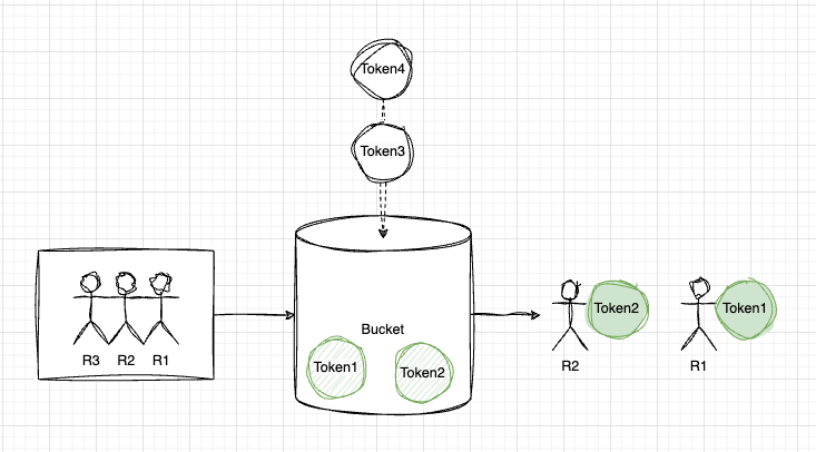 그러면 이제 요청(Request)이 들어올 때마다 Bucket이는 Token을 소진시키기 시작한다. 만약에 해당 토큰이 Bucket에 충분치 않다면 요청 자체가 거부되거나 대기될 예정이다.
