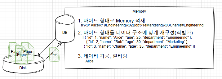 데이터베이스는 Disk에서 페이지를 하나 주워온다. 그 뒤, Memory에서 byte 단위로 역직렬화 작업을 수행하여 데이터를 구조화 하고 사용자가 요청한 결과를 생성해야 한다.