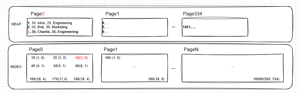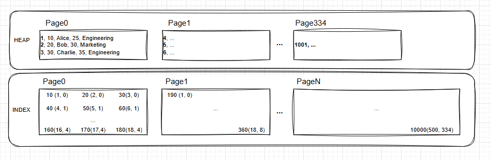 그에 비해 Index에서는 10(1, 0)과 같이 번호 뒤에 Tuple을 갖고 있는데, 이는 10이라는 ID의 데이터는 Heap내의 1번 행으로 Page0에 존재한다는 뜻이다. 즉 ID(row, pageNo) 로 볼 수 있다.