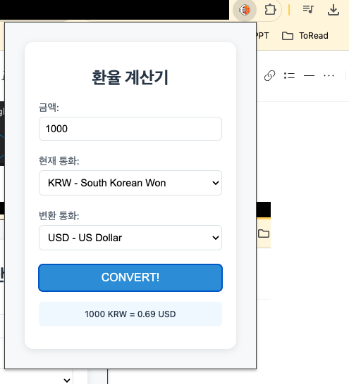 - popup.html는 내 기준 필수적인 요소다. 크롬 내 상단바에 익스텐션 아이콘으로 클릭 시 나타나는 UI다.