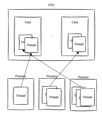 만약 누군가 이 각각이 많을수록 어떠한 영향을 줍니까?라고 물어보면 단순히 생각했을 때 Core는 뇌의 역할이니까 뇌가 많을수록 처리량이 많을 것 같고, 한 프로그램 내에 Process가 여러개로 있다면 병렬처리할 기회가 많이 생길 것 같아서 괜찮을 것 같고, Thread가 여러 개라면 이 또한 병렬처리에 유리할 것 같다.
