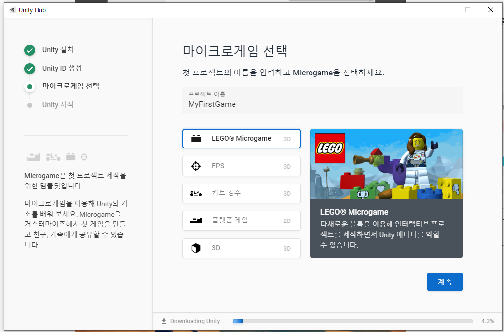 Unity는 무게가 10기가다. 비쥬얼스튜디오 하나 더 생긴 느낌이다. D드라이브 선택이 옳았다. 위의 화면에서는 3D를 선택하고 Unity가 다 설치될 때까지 기다려야 한다. 기다리는 동안 침착맨 틀어놓고 스팀으로 색칠놀이했다.