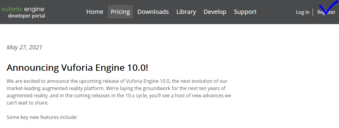 Vuforia(클릭이동) 로 이동하여 register하자.