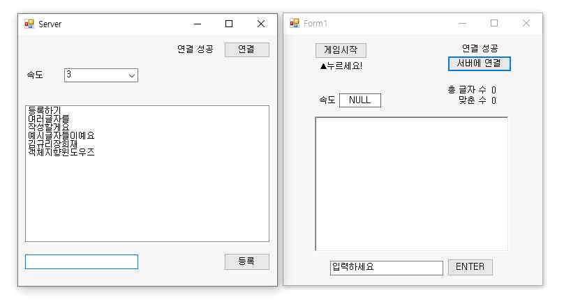 Server측 ListBox데이터 => Client측 string List 으로 끌고 오게되며, 해당 입력된 값들은 랜덤으로 섞여 랜덤된 상단위치에서 하향으로 떨어진다. 그리고 5개 이상 맞추면 프로그램은 팝업창을 뛰우며 종료된다.