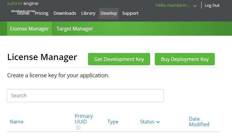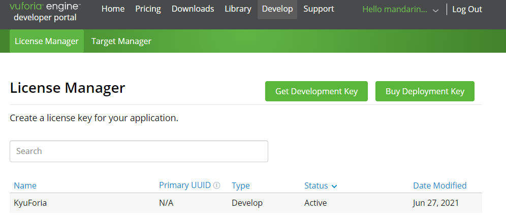 [vuforia SDK] > [Add Vuforia Engine 패널] 클릭 > [License Manaeger]이동 > [Get Development Key 패널] 클릭