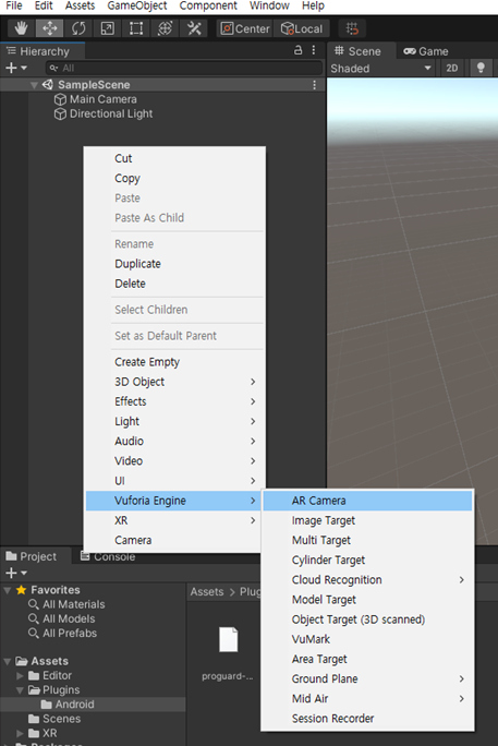 [계층뷰] > [마우스 우클릭, AR camera] > [팝업 accept] > Camera 확인