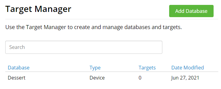 Target manager창으로 넘어가면 Database를 설정할 수 있다. 난 오전부터 당이 딸려 Dessert 데이터베이스를 만들었다.