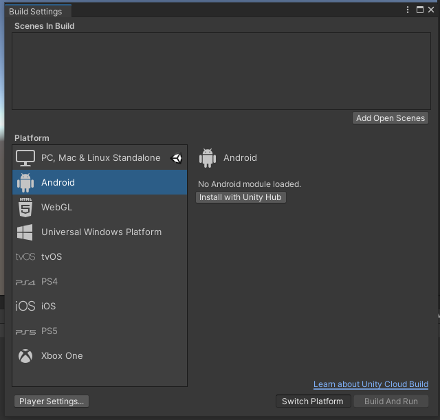 사진처럼 [File > Build Settings > Android > install] 쭉쭉 모듈설치했다. 하는김에 한국어 팩도 깔았다.