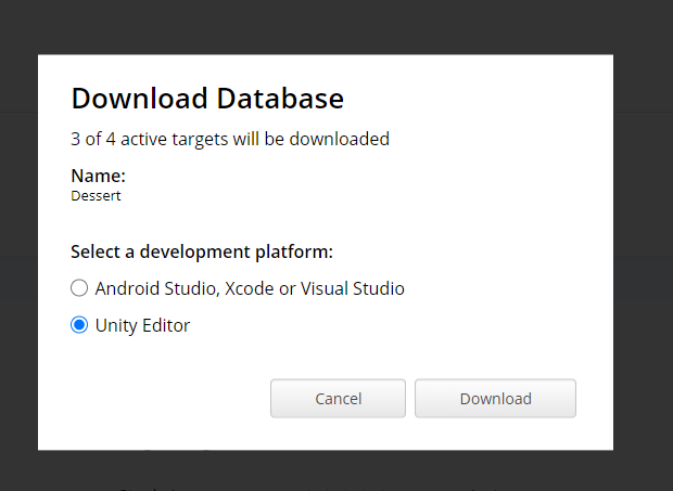 만든 데이터베이스는 다운로드를 하는데 이때 Unity Editor로 체크하고, 다운받고, 클릭하고, 만들어진 pakage를 import시켜주기.