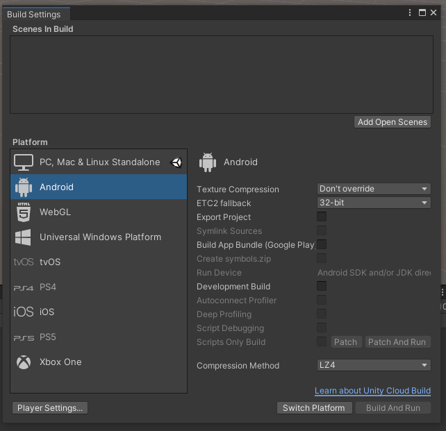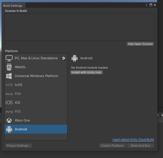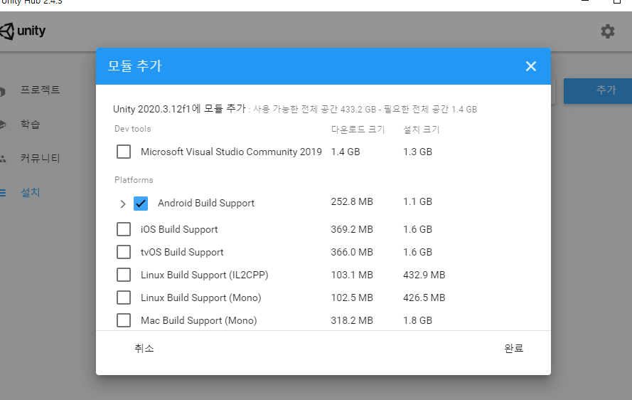 사진처럼 [File > Build Settings > Android > install] 쭉쭉 모듈설치했다. 하는김에 한국어 팩도 깔았다.