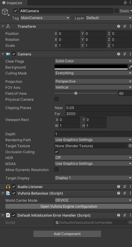 그러고 Unity화면에서 ARCamera뷰가 선택된 채로 우측에 보면 inspector이 있었을 텐데, Open Vuforia Engine Configuration에 들어가면 라이센스 키를 붙여넣는 란이 있고 대충 그런 감으로 완료하면 된다.