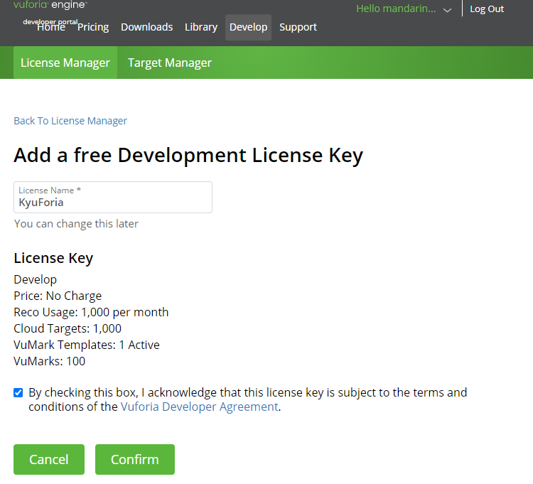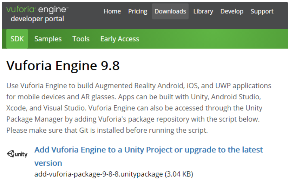 [vuforia SDK] > [Add Vuforia Engine 패널] 클릭 > [License Manaeger]이동 > [Get Development Key 패널] 클릭