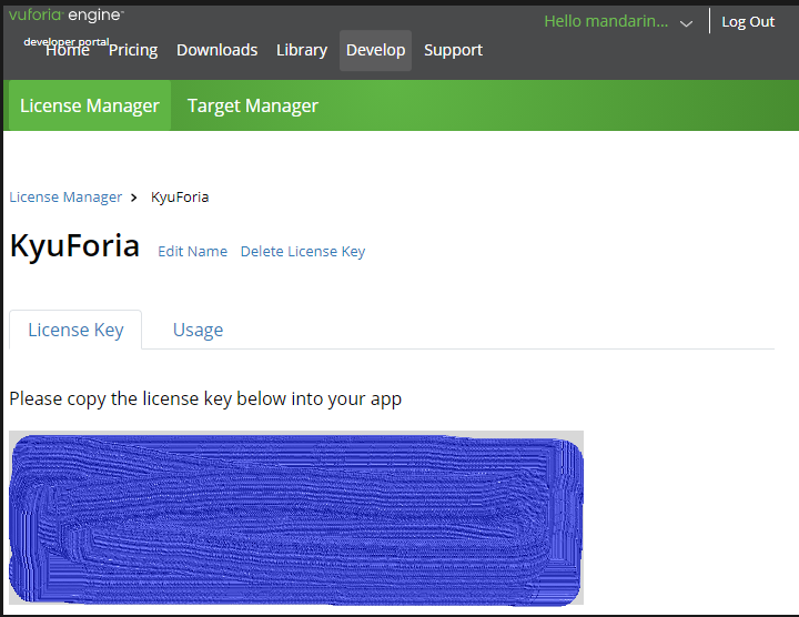 Vuforia페이지에서 나의 라이센스 키를 복사하자.