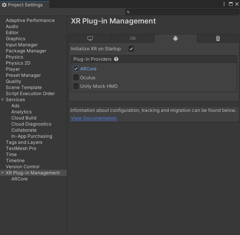 내가 사용할 ARCore의 기능을 해당 setting란에서 설정