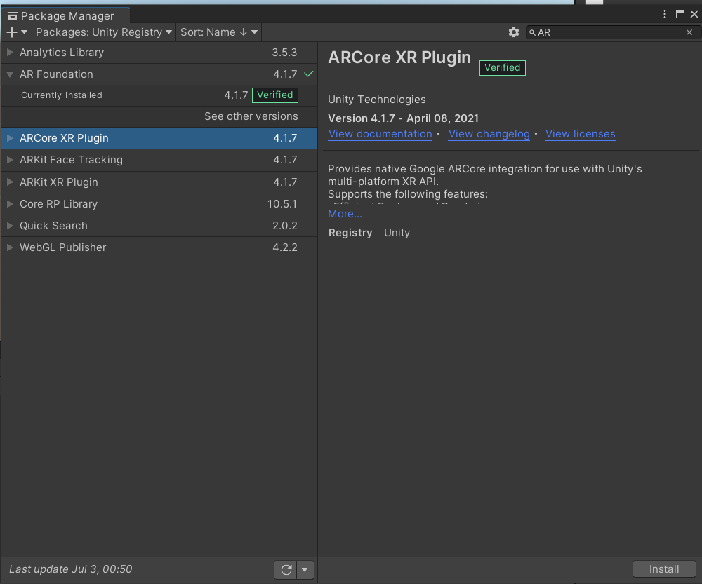 안드로이드 개발이 우선이므로, ARfoundation과 ARCore를 선택하여 install한다 (ios였으면 ARkit이었겠지)