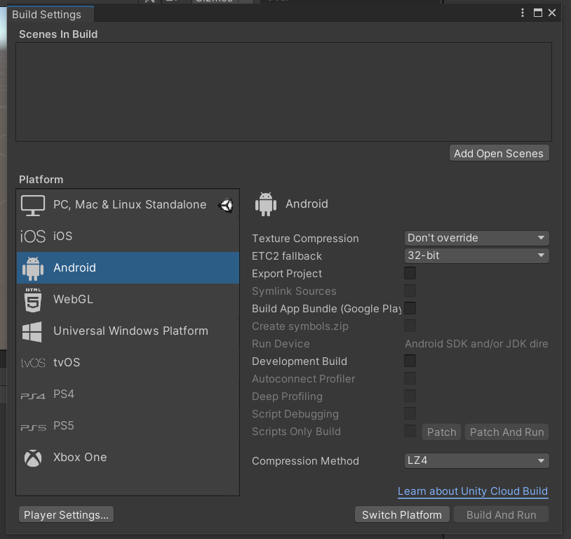 안드로이드 플랫폼으로 설정하여 Switch Platform 고.