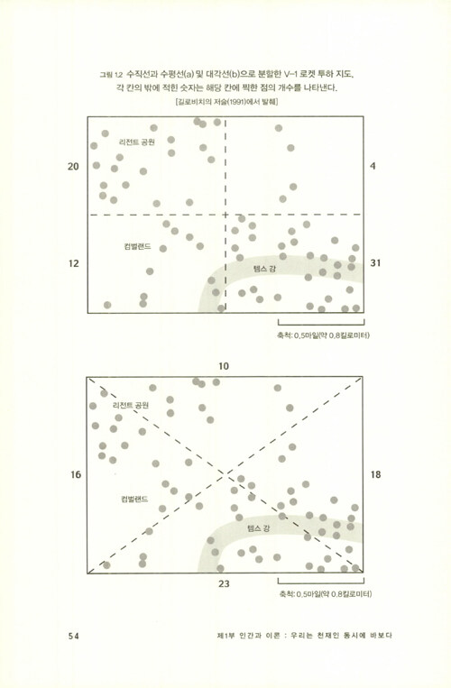 이 사진은 2차 세계대전 때의 실제 로켓 투하 지도이다. 상단의 이미지를 보면 특정 지역에 미사일이 의도적으로 투하된 듯하지만, 하단의 이미지를 보면 분할된 영역에 고르게 분포되어있음을 시각적 정보로 읽어낼 수 있다. 실제로 특정 지역에 투하하는 건 불가능했다.