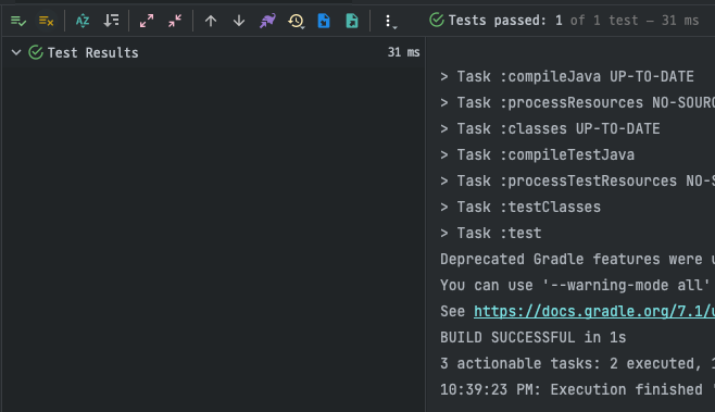 = 테스트가 여러 개인데 하나만 실행했다는 경고일 뿐임