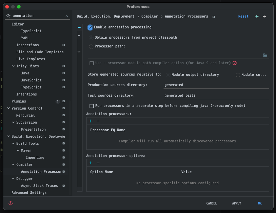 커맨드+, > annotation 검색 > Enable annotation processing 선택