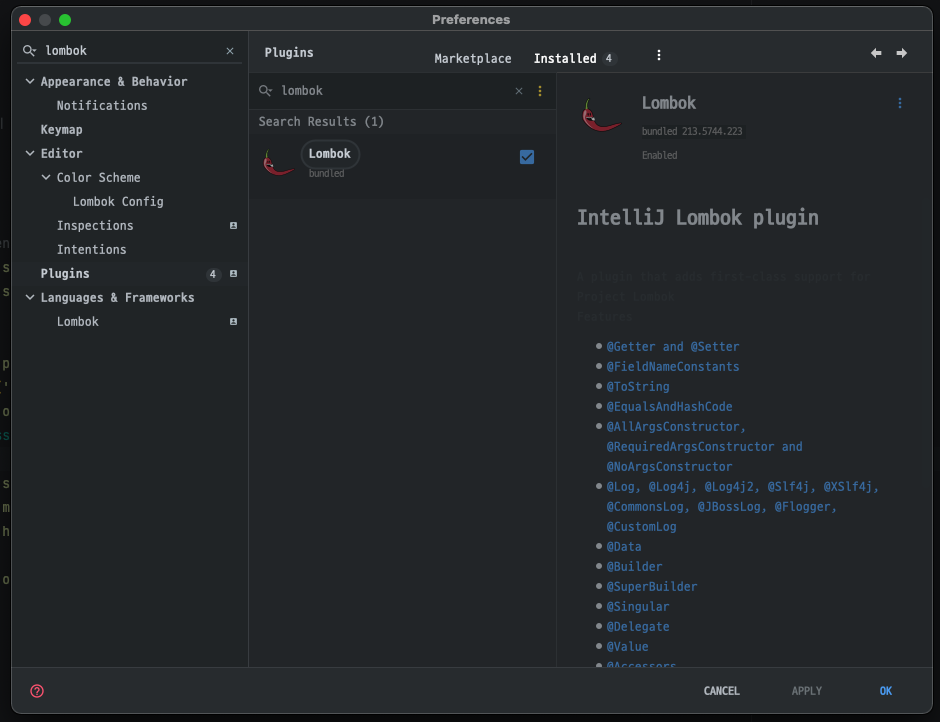 2021기준 최신판에서는 lombok이 이미 내장되어 있으니, 좌측창에서 검색