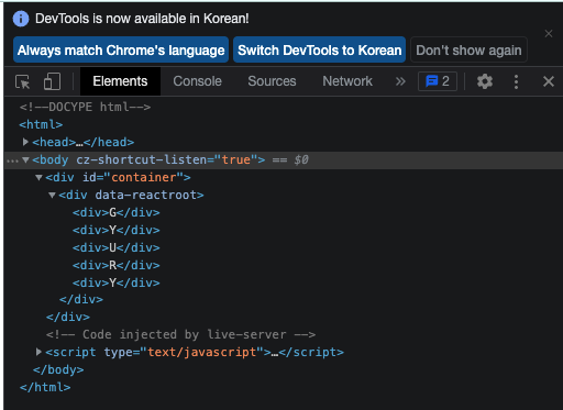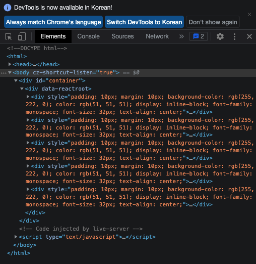 - div를 포함한 여러 JSX코드 조각이 아래와 같이 HTML로 바뀐다. (ft. 개발자모드)